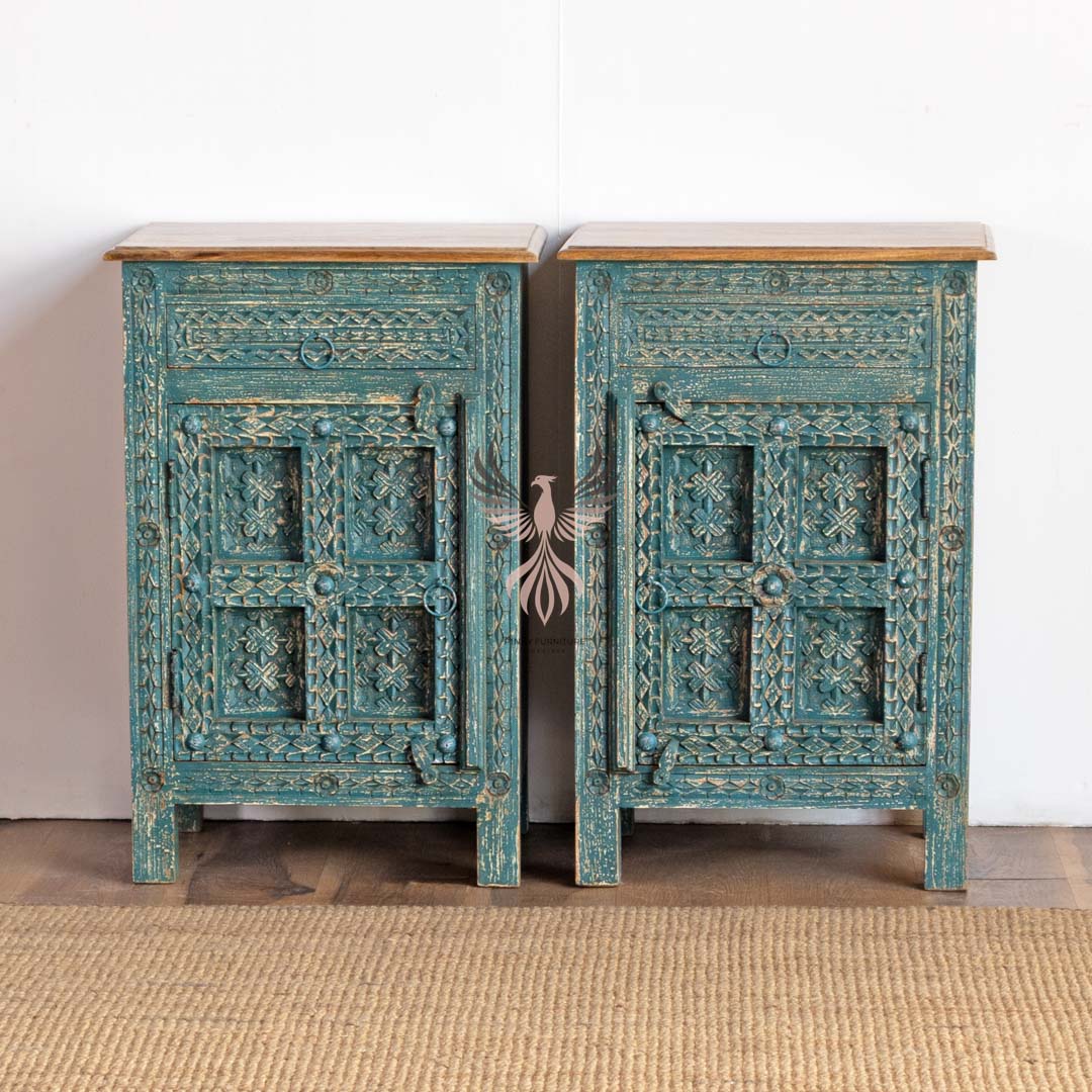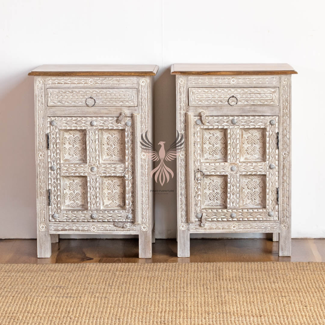 Bedside Table Carved 1 Door 1 Draw Set of 2